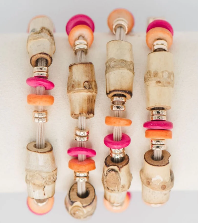 Set of 4 hair tie bracelets featuring bamboo-detailed beads in coconut. Designed to be worn in your hair or on your wrist, they add a relaxed tropical touch while keeping a go-to hair tie within reach.