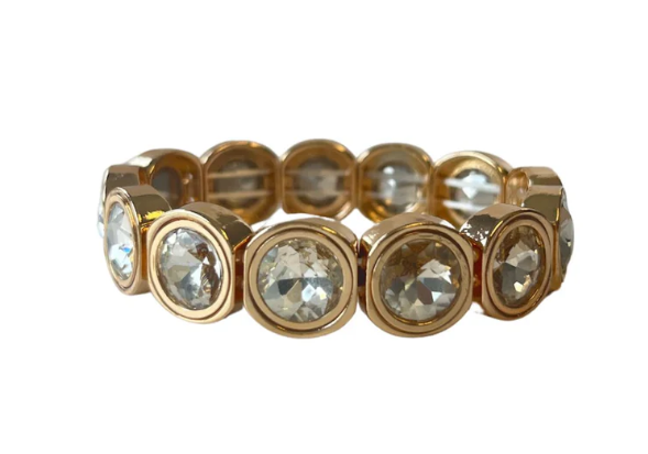 Round acrylic jewel stretch bracelet with gold detailed edging for a complete finish. Adjusts to fit wrist with elastic band.