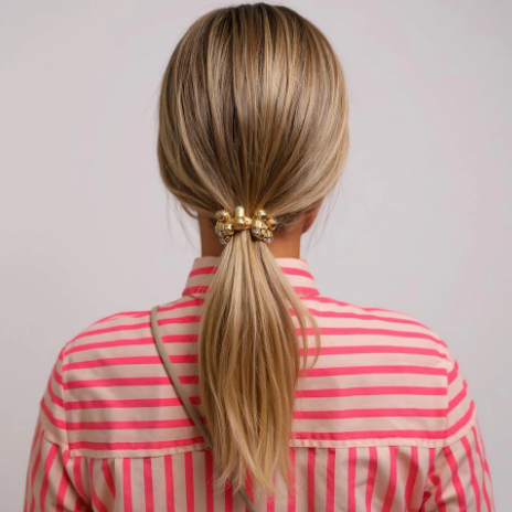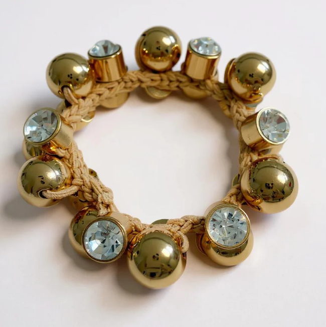 Chunky Hair Scrunchie with glossy gold balls and signature acrylic crystal rhinestones for an extra special sparkle.
