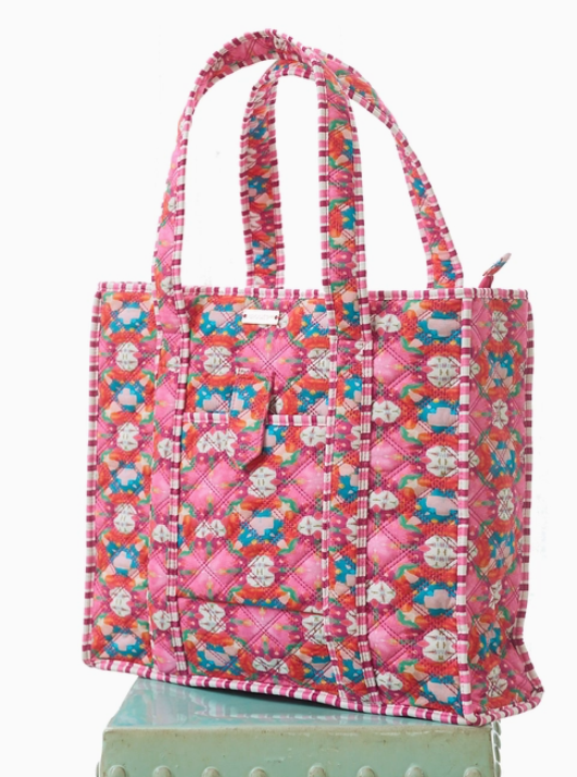 Dimensions: 13" (H) x 16" (W) x 4" (D) Details: 25" long handle Zipper closure Exterior pocket, perfect for your phone or car keys Several interior pockets of various sizes Striped Lining Pipin